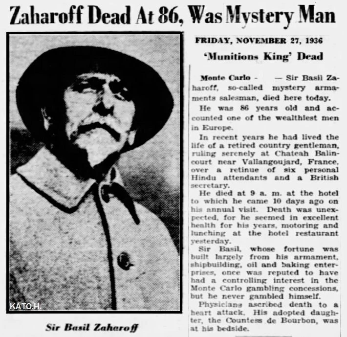 His name was Sir Basil Zaharoff, GCB, GBE — born Vasileios Zacharias (Βασίλειος Ζαχαρίας Ζαχάρωφ) in the Ottoman Empire, 1849. One of the richest men in the world during his lifetime. Known to contemporaries as the "Merchant of Death" and the "Mystery Man of Europe."